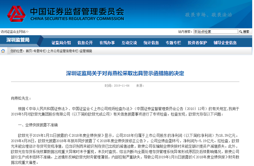 在任职3年后,2019年11月,深圳证监局对肖燕松采取出具警示函措施的决定。由于欧菲光存在2019年业绩快报披露不准确、业绩快报修正不及时、信息披露管理制度执行不严等问题,肖燕松对相关问题负有主要责任。