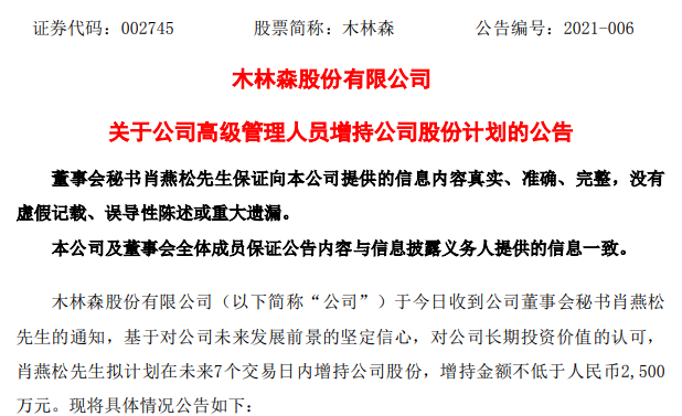1月12日晚间,木林森发布高管增持公告计划。基于对公司未来发展前景的坚定信心,对公司长期投资价值的认可,新任董秘肖燕松拟计划在未来7个交易日内增持,金额不低于2500万元。作为木林森初来乍到的新任“80后”董秘,肖燕松上任带来的“伴手礼”可算豪气。