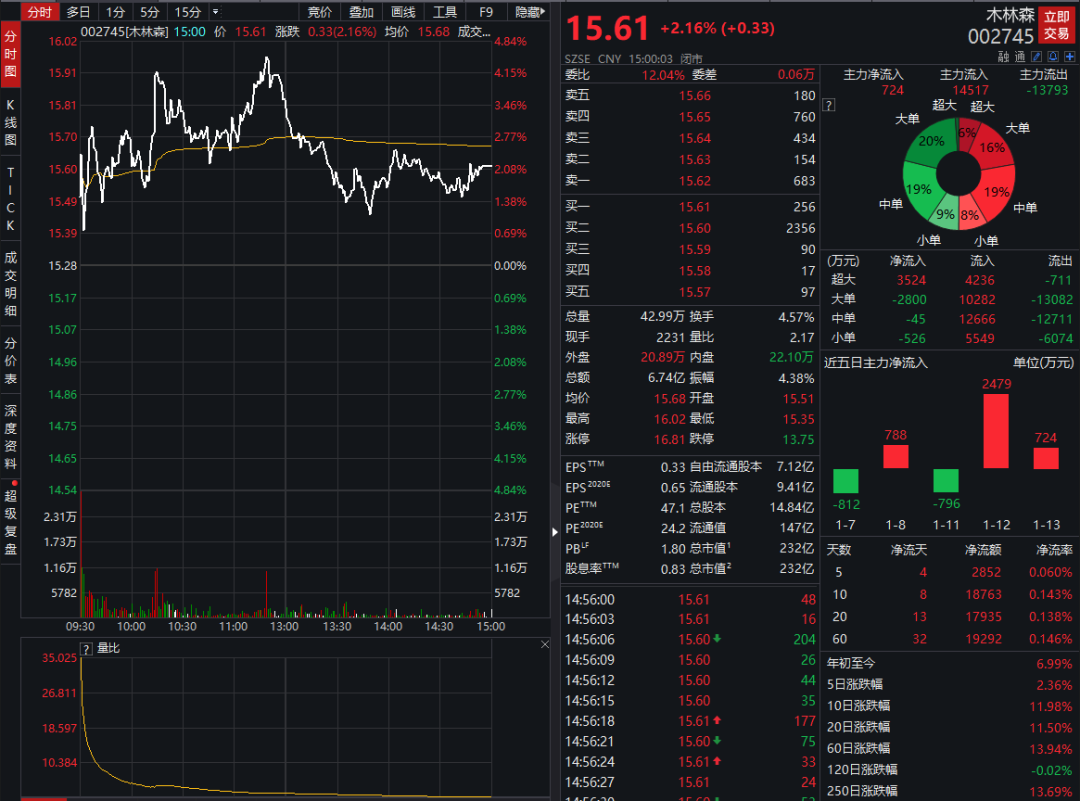 最近一个月以来,木林森的股价走势整体向好。截至1月13日收盘,木林森以15.61元/股报收。按此计算,肖燕松2500万元的资金约可获得160万股股票。